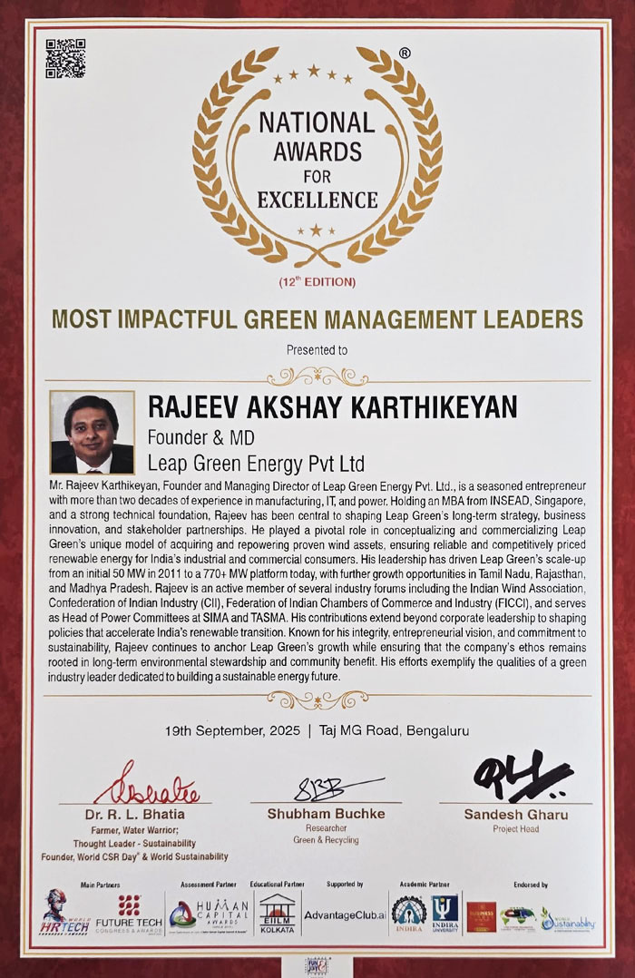 Mr. Rajeev Akshay Karthikeyan, Founder and Managing Director of Leap Green Energy, has been awarded the "Most Impactful Green Management Leader Award" and Leap Green Energy received the "Green Future Leadership Award" during the National Awards for Excellence held on 19th September 2025 at Bengaluru