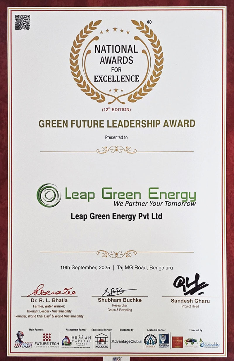 Leap Green Energy has won the "Best Clean and Green Energy Producer" award for the Year 2023 from Making of Developed India Awards on 17th February 2023
